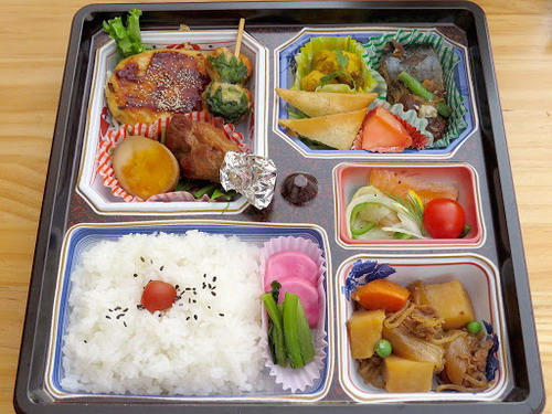 揚げ物を極力減らした和風のあっさりしたお弁当です。一例はお豆腐の小判焼き、鶏の香酢煮、煮魚、サーモンのマリネ、肉じゃが、香の物など。