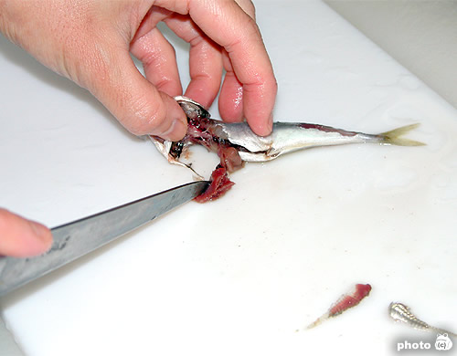 エラぶたに包丁の先を入れ、引き抜くとエラとはらわたがいっしょに取れます。この処理をしないと生臭〜い南蛮漬けになってしまう。